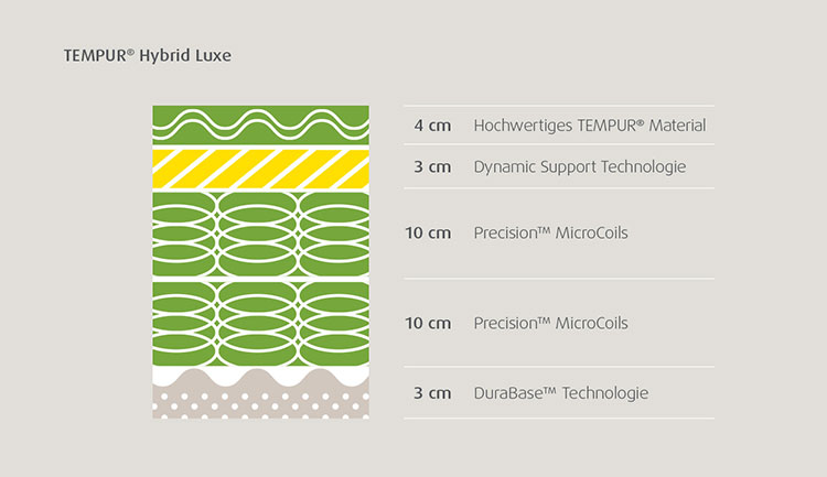 Durch den besonderen Schichtaufbau der Matratze sorgen formbeständige Federn aus kaltgeformten Stahl zusammen mit dem hochwertigen druckentlastenden TEMPUR®-Material für optimale Anpassung und Unterstüzung Ihres Körpers. Die Matratze besteht aus einer 3 cm dicken DuraBase™-Schicht als Basis und darauf aufliegend einer doppelten Schicht (á 10 cm) aus Precision™-MicroCoils (einzeln ummantelten Taschenfedern), die für eine sofortige Reaktion auf Bewegungen Ihres Körpers sorgen. Eine zusätzliche 3 cm dicke TEMPUR®-Schicht mit der Dynamic-Support-Technologie sowie eine 4 cm dicke TEMPUR®-Schicht aus hochwertigem TEMPUR®-Material sorgen für einen besonderen Komfort und angenehmen Schlaf.